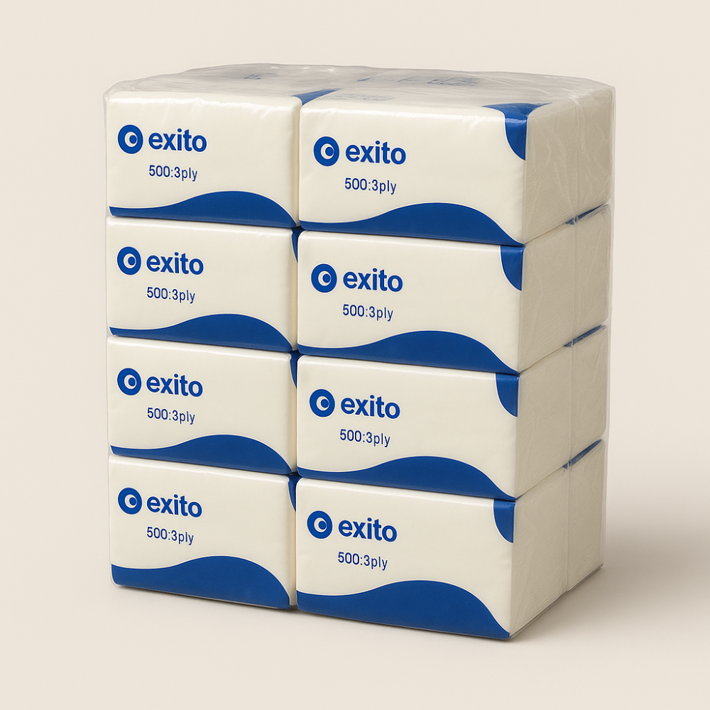 مناديل وجه من ماركة "Exito"، وهي مناديل ثلاثية الطبقات (3-ply) وتحتوي كل عبوة على 500 منديل.